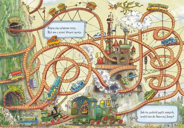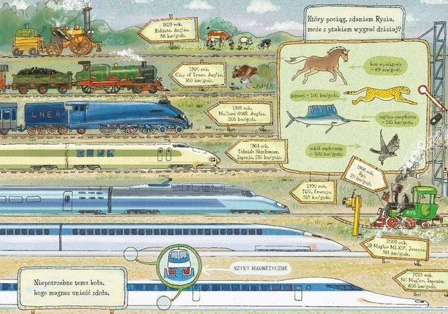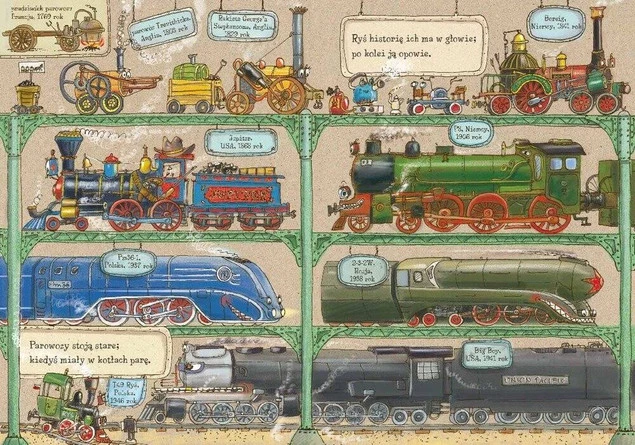 Najnowsza pozycja w popularnej serii "Opowiem ci, mamo", narysowana z humorem przez Artura Nowickiego, tym razem pozwoli dzieciom wybrać się w podróż koleją i poznać bogaty świat najróżniejszych pociągów. Najmłodszych czytelników czeka wiele atrakcji. Razem z głównym bohaterem – parowozem tendrzakiem Rysiem – odwiedzimy muzeum lokomotyw, parowozownię i najciekawsze dworce kolejowe, poznamy dziwne pojazdy szynowe oraz mapy szlaków kolejowych, a także przejedziemy się koleją górską i odpoczniemy na bocznicy.
