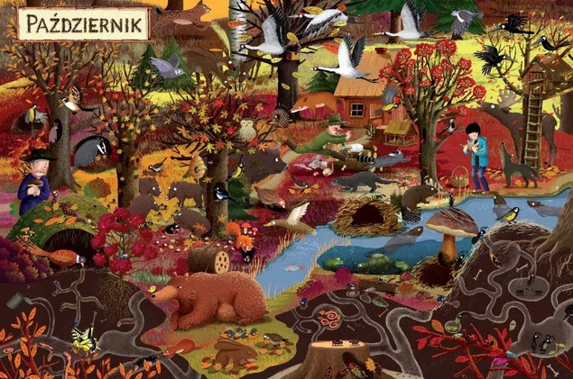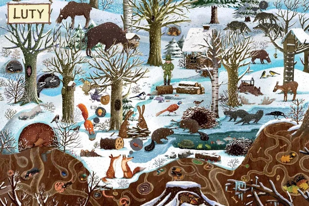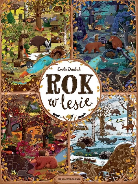 Dziki, wilki, bażanty, niedźwiadek, mrówki, dzięcioł, lisy, borsuk, zaskrońce, żaby, łoś i wiele innych zwierzaków zamieszkuje pewien las. Jak się bawią, a jak odpoczywają? Kto śpi w dzień, a kto w nocy? Kto się z kim lubi? Kto jakie ma przysmaki? Poszukajcie odpowiedzi na kartach tej niezwykłej książki. "Rok w lesie" zawiera dwanaście rozkładówek z kolejnymi miesiącami jednego roku. Każdy miesiąc to ten sam szczegółowo rozrysowany kadr lasu z mieszkańcami pokazanymi w innych sytuacjach, warunkach pogodowych, w innej porze dnia lub nocy. Dwie dodatkowe rozkładówki zawierają prezentację bohaterów i interaktywną zabawę. "Rok w lesie" można oglądać godzinami. Ta niezwykła książka pobudza wyobraźnię, rozwija spostrzegawczość, zdolność logicznego myślenia, szukania związków przyczynowo-skutkowych, umiejętność opowiadania, a przede wszystkim gwarantuje świetną zabawę.
