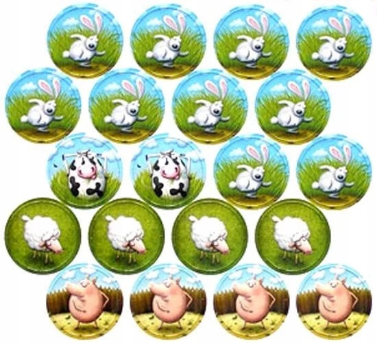- 120 żetonów z ilustracjami zwierząt: 60 królików, 24 owce, 20 świń, 2 krów, 4 koni,