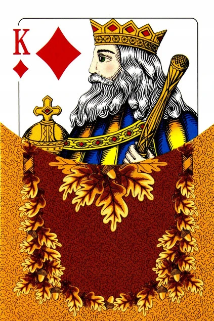 Charakterystyczne bursztynowe i zielone rewersy ozdobione są liśćmi dębu, a figury i kolory oznaczone międzynarodowym wzorem. Karty są odpowiednie do wszystkich rodzajów klasycznych gier karcianych. Talia dla graczy lubiących klasykę w tradycyjnym wydaniu.