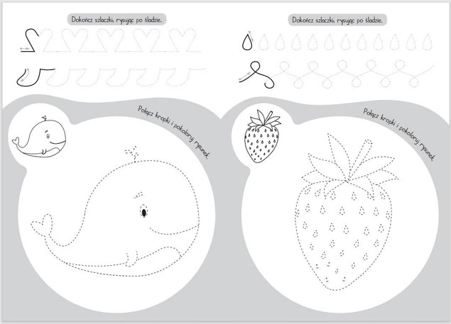 Różnorodny zestaw szlaczków oraz sympatyczne rysunki do dokończenia i kolorowania wpływają na sprawność manualną i grafomotoryczną dziecka. Są doskonałą rozgrzewką przed pisaniem literek i cyferek, a także świetną zabawą!