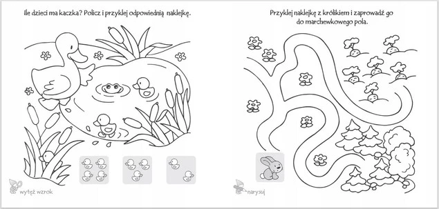 i syntezę wzrokową. Książeczki zawierają również zadania rozwijające sprawność manualną dzieci, m.in. wklejanie w odpowiednie miejsca naklejek, rysowanie po śladzie czy łączenie elementów.