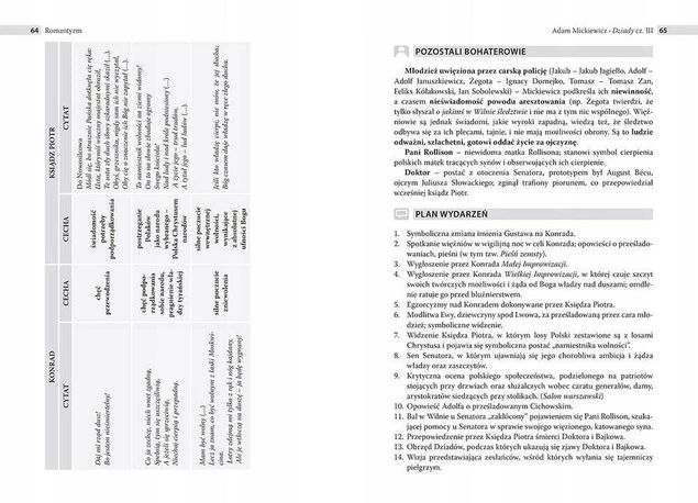 Obejmuje wszystkie lektury obowiązujące z zakresu podstawowego, które będą wymagane na sprawdzianach oraz na maturze z języka polskiego. Każda z lektur została dokładnie omówiona, zawiera streszczenia i problematykę, spis bohaterów, a całość uzupełniają notki biograficzne autorów. Ponadto zamieszczono w niej analizy i interpretacje wymaganych na języku polskim wierszy oraz omówiono cechy charakterystyczne każdej epoki literackiej. W części drugiej, zgodnie z programem szkolnym, omówiono epoki Romantyzmu i Pozytywizmu.