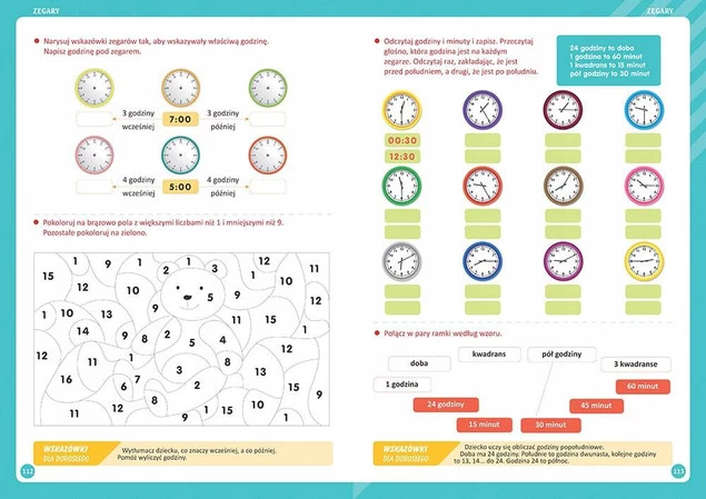 Dzięki różnorodności zadań każde dziecko znajdzie to, co lubi robić, i na pewno nie będzie się nudziło. Mamy tutaj m.in. rozwiązywanie labiryntów, kolorowanie czy dorysowywanie elementów. Nie zabrakło oczywiście typowych zadań tekstowych o zróżnicowanym poziomie trudności. Całość bardzo kolorowa i przykuwa uwagę przedszkolaka. Podoba mi się, że na każdej stronie jest wartościowa wskazówka dla dorosłego, informująca, na co zwrócić uwagę dziecku (np. przypomnij dziecku, że dłuższa wskazówka zegara wskazuje minuty, krótsza godziny).