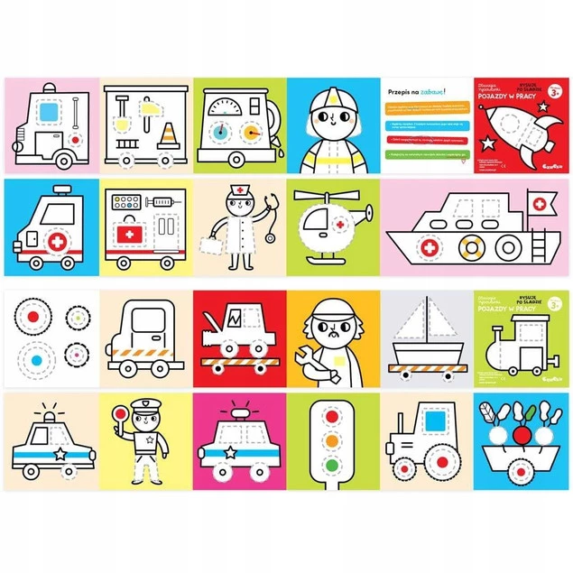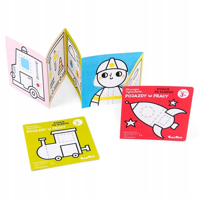 Witajcie wśród pojazdów do zadań specjalnych. Ruszajcie z nami do akcji i rysujcie po śladzie! Kreatywny zestaw zawiera 2 długie książeczki harmonijki z 23 pełnymi zabawnych detali ilustracjami, które zachęcają dzieci do sięgania po kredki i rysowania.