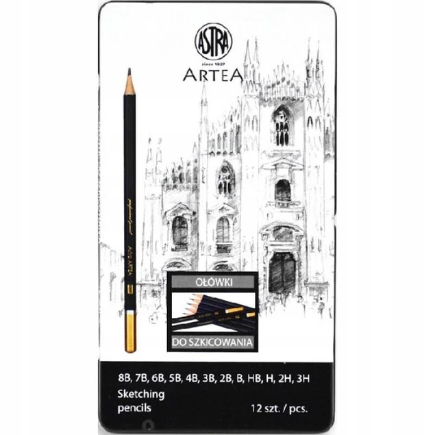 Zestaw ołówków do szkicowania Artea mix 12 sztuk metalowym pudełku Astra