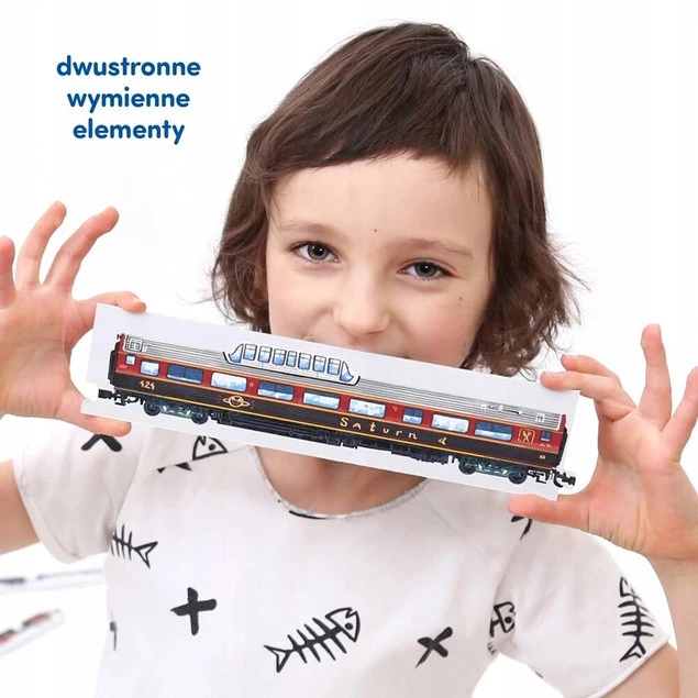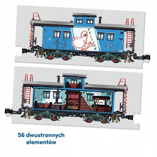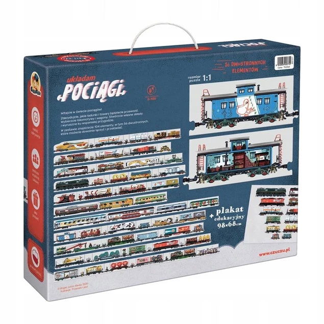 Witajcie w świecie pociągów! W edukacyjnym zestawie puzzli znajdziecie 104 elementy. 56 z nich jest dwustronnych, co pozwoli wam zajrzeć do wnętrza lokomotyw, wagonów i kontenerów z ładunkami. Puzzle można ze sobą dowolnie łączyć, a ze wszystkich powstaje skład o długości 9,5 metra. Stwórzcie własne składy i wyruszcie ku wspaniałej przygodzie.