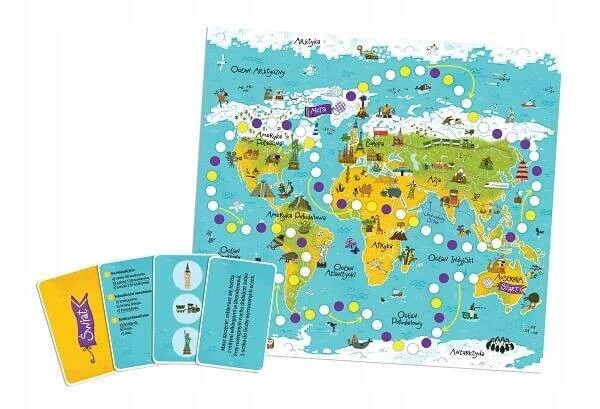 Gra Świat to klasyczny wyścig, w którym wygrywa ten, kto pierwszy dotrze do mety. Ruch graczy przyspieszają trzy rzeczy: udzielenie odpowiedzi na jedno z 90 pytań związanych z różnymi miejscami na Ziemi i ich mieszkańcami, wykonanie działania opisanego na karcie ruchu oraz wypatrzenie na planszy zwierzęcia, rośliny lub innego obiektu przedstawionego na karcie. Niezwykła wyprawa dookoła świata stwarza okazję, by rozwiązać wciągające zagadki oraz sprawdzić swój refleks i spostrzegawczość.