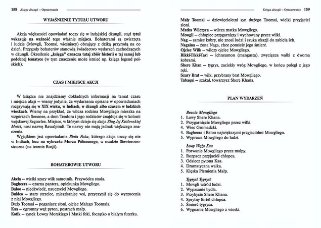 Wydanie Księgi dżungli kompletne bez skrótów i cięć w treści. W tym wydaniu znajdziesz odpowiedzi na pytania z podręcznika - „pewniak na teście”, czyli wskazanie zagadnień, które zwykle pojawiają się w pytaniach z danej lektury we wszelkich testach sprawdzających wiedzę, a także w podręcznikach i na klasówkach. Zawiera bardzo szczegółowe streszczenie oraz drugie skrócone, ułatwiające szybkie przygotowanie się przed lekcją. Opracowanie zawiera plan wydarzeń, wnikliwie wyjaśnioną problematykę oraz szerokie charakterystyki bohaterów.