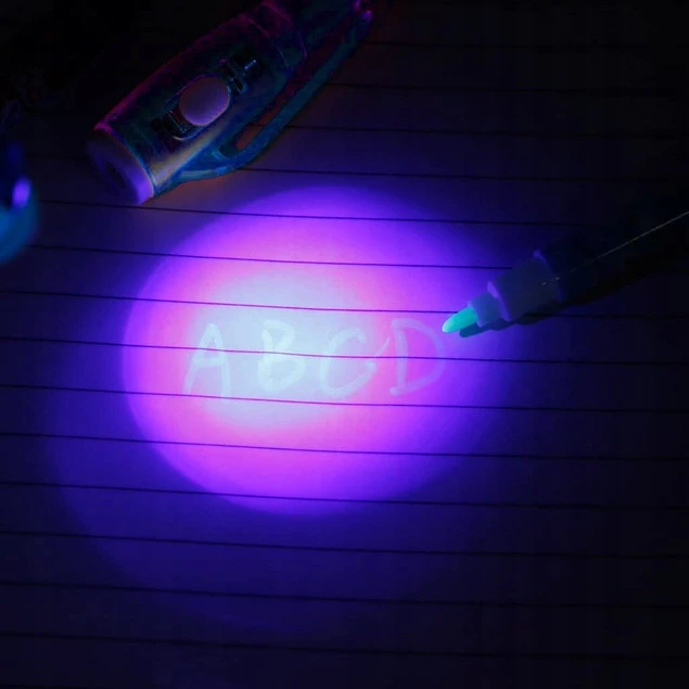 Magiczny długopis z lampką LED posiada tusz widoczny tylko w świetle wbudowanej latarki UV. Tusz podczas pisania jest niewidoczny, aby przeczytać niewidzialną wiadomość należy podświetlić kartkę. To świetna zabawa w ukrywanie informacji przed niepożądanymi osobami i idealny sposób, by strzec swoich sekretów. Zasilanie na baterie. Dostępne 3 kolory: zielony, fioletowy lub niebieski.