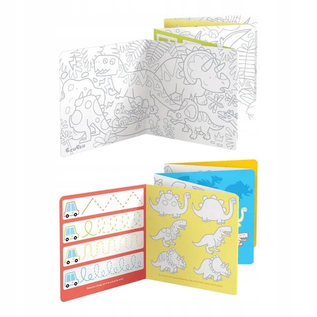 Kreatywny zestaw zawiera 2 długie książeczki harmonijki z 2 panoramicznymi kolorowankami oraz mnóstwem kreatywnych i edukacyjnych zadań.