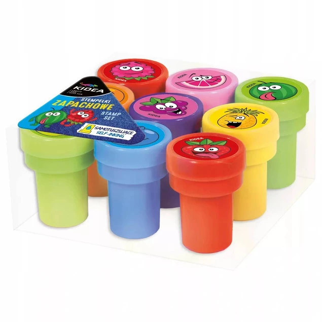 Stempelki zapachowe wzbogacone zostały w przyjemny aromat, który uatrakcyjnia produkt i sprawia, że dzieci chętniej po nie sięgają. Nowe, ciekawe wzory w szalone owoce (malina, truskawka, pomarańcza, arbuz, grejpfrut, jagoda, ananas, jabłko, winogrono) udekorują każdy rysunek małego artysty. Stempelki są samotuszujące, więc nie wymagają używania dodatkowej poduszki z tuszem.