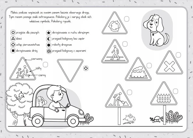 Przewodnik po znakach drogowych dla każdego superbohatera! Podróże z pieskiem Maksiem, kotkiem Czarusiem i króliczką Marcysią fascynują ruchem ulicznym, oswajają z tajemniczym językiem miasta oraz uczą bezpiecznego poruszania się. Są minisprawdzianem umiejętności na drodze, a także świetną przygodą!