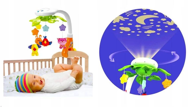 Karuzelka dla niemowlaka to zabawka typu 2 w 1: muzyczna karuzelka i projektor z rzutnikiem. Karuzelka obraca się grając spokojne melodie. Materiałowe zwierzątka powoli przesuwają się. Projektor wyświetla na suficie obrazki których kolory powoli zmieniają się. Zabawka pomaga dziecku zasnąć . Łagodne światło oraz delikatne dźwięki pomogą uspokoić naszego maluszka.