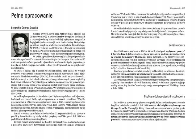 Wydanie Roku 1984 kompletne bez skrótów i cięć w treści. W tym wydaniu znajdziesz odpowiedzi na pytania z podręcznika - "pewniak na teście", czyli wskazanie zagadnień, które zwykle pojawiają się w pytaniach z danej lektury we wszelkich testach sprawdzających wiedzę, a także w podręcznikach i na klasówkach. Książka zawiera pełen tekst lektury. Na końcu książki zamieszczono opracowanie, w którym znajduje się bardzo szczegółowe streszczenie oraz drugie skrócone, ułatwiające szybkie przygotowanie się przed lekcją. Opracowanie zawiera ponadto plan wydarzeń, wnikliwie wyjaśnioną problematykę oraz szerokie charakterystyki bohaterów.