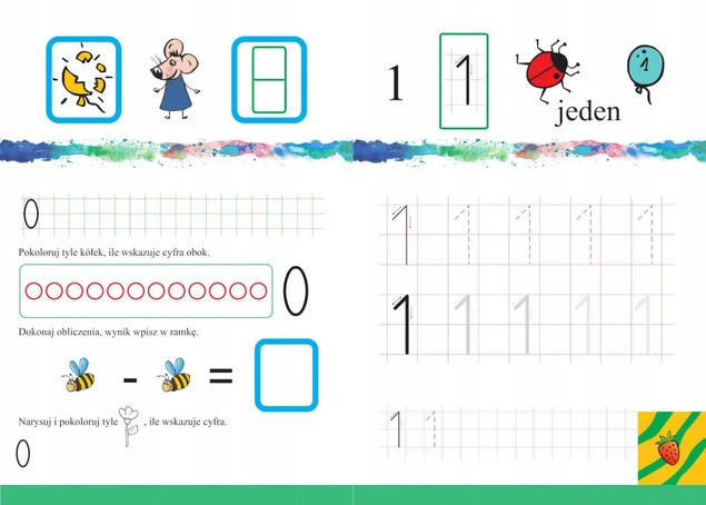 W książeczce znajdują się ćwiczenia polegające na pisaniu po śladzie, odwzorowywaniu kształtów oraz samodzielnym pisaniu i liczeniu.