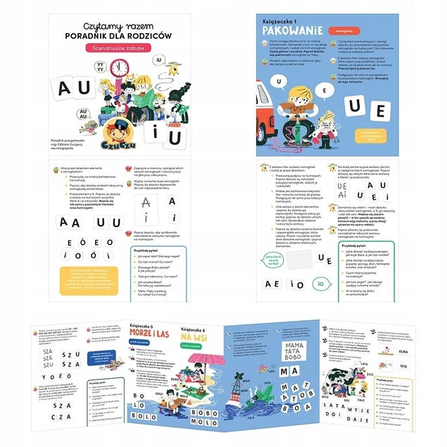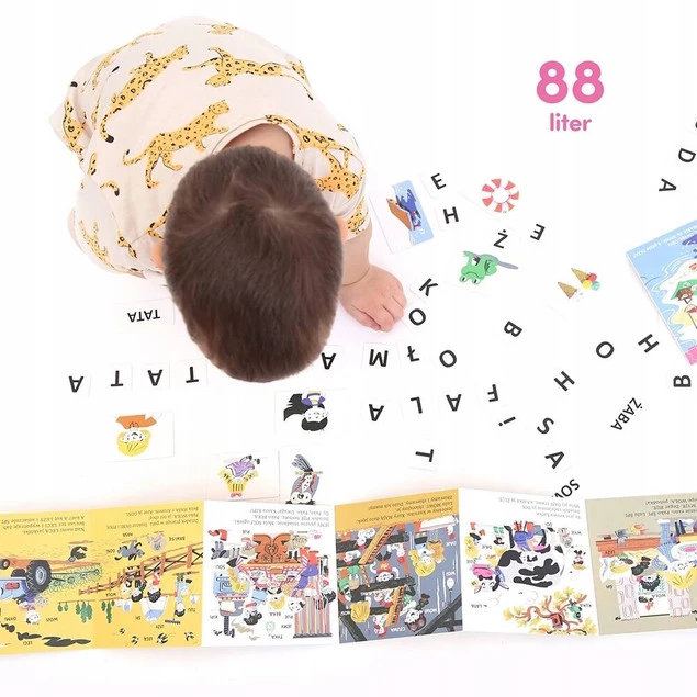 - Zestaw zawiera: 6 książeczek harmonijek, 88 liter, 20 wyrazów, 20 obrazków, poradnik dla rodziców i scenariusze zabaw