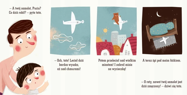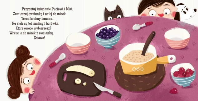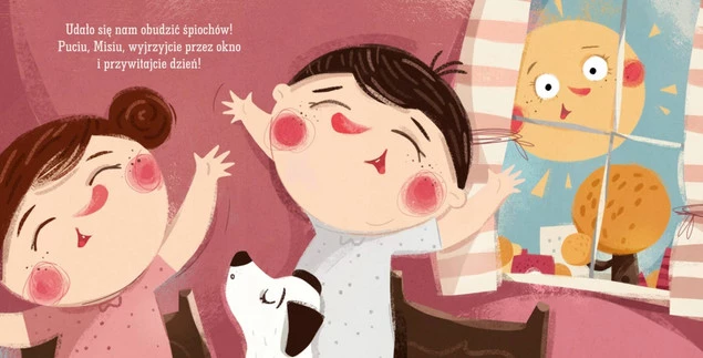 Pucio i Misia z radością rozpoczynają dzień. Witają się ze słońcem, dostrzeżoną za oknem wiewiórką, a nawet samochodami na ulicy. Potem myją zęby, ubierają się, jedzą śniadanie. Nie zapominają też o nakarmieniu psa i kota.