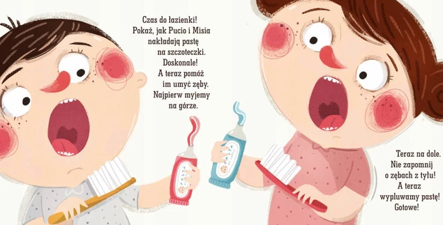 W każdej czynności towarzyszą im mali czytelnicy, ta interaktywna książka zachęca bowiem maluchy do naśladowania ulubionych bohaterów, dzięki czemu poranne obowiązki stają się wspaniałą zabawą.