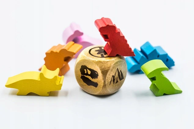 W pudełku znajdziesz wyjątkowe elementy gry: 60 drewnianych pionków dinozaurów, specjalną kostkę, 5 dwustronnych plansz, miseczki na pionki oraz woreczek do losowania dinozaurów.