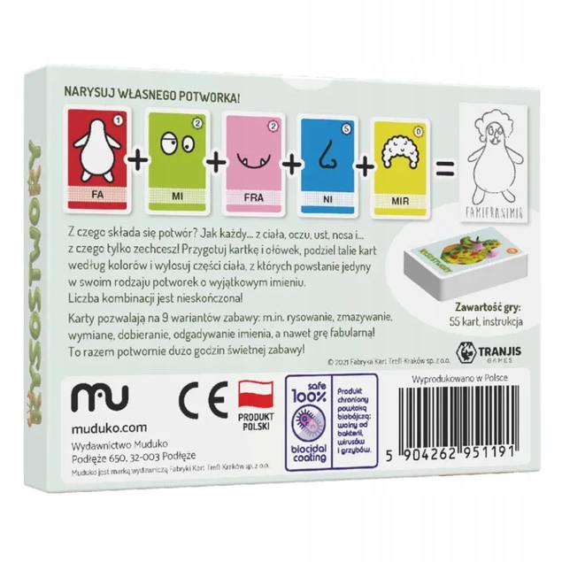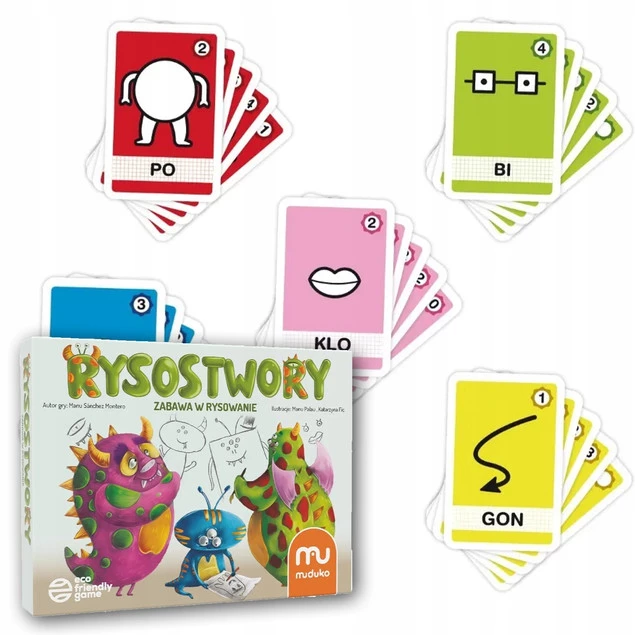 Weź kartkę, ołówek, dobieraj karty, narysuj swojego własnego potworka i nazwij go. Czy dasz radę wymówić jego imię? A może dla odmiany pobawimy się w… zmazywanie potworka? Dobieranie? Albo pomożemy potworkom, które pogubiły swoje części ciała, pozbierać się do kupy? Wariantów zabawy jest aż 9!