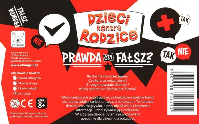 Ile dni ma rok przestępny? Czy tofu to rodzaj ziemi? Z czego powstaje diament? Którą planetą od Słońca jest Ziemia? Wiele ciekawych pytań sprawi, że będziecie świetnie bawić się odpowiadając co jest prawdą,a co fałszem. To kultowa dynamiczna rozgrywka, a przy okazji wiele ciekawych informacji. Dzieci rywalizują z rodzicami. W grze znajdziecie pytania przygotowane specjalnie dla dzieci i dla rodziców.