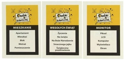 Dużo zabawy i śmiechu:) Dwie drużyny opisują hasło owijając nieco w bawełnę. Nie mogą używać prostych skojarzeń, związanych z przedstawianym hasłem. Na kartach z hasłami poznacie zakazane słowa. Sprawdź czy uda Ci się owinąć przeciwnika w bawełnę:) Wykaż się kreatywnością i sprytem!