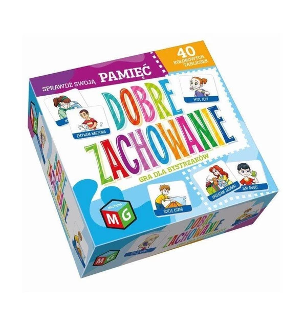 DOBRE ZACHOWANIE PAMIĘĆ to gra rozwijająca pamięć, koordynację wzrokową i spostrzegawczość. Sprawdź, czy dasz radę zapamiętać wszystkie obrazki! W grze wygrywa ten, kto najlepiej zapamięta położenie tabliczek z przykładami wzorowego zachowania, odkrytych na chwilę, spośród wszystkich ilustrowanych tabliczek leżących na stole rewersem do góry. Zawartość pudełka: ilustrowane tabliczki 40 szt., instrukcja.