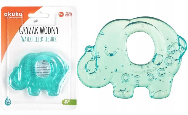 Gryzaczek w kształcie niebieskiego słonika wypełniony chłodną destylowaną wodą. Posiada on wypustki, które przyniosą ulgę podrażnionym dziąsłom niemowlaka. a dzięki dużemu otworowi pośrodku jest wygodny do chwytania przez małe rączki.