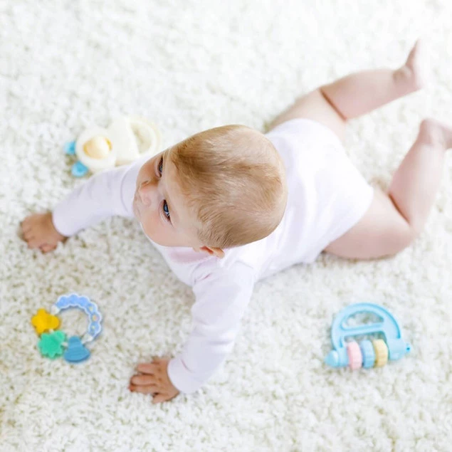 Grzechotka z gryzakiem łączy w sobie zalety gryzaka i grzechotki, gdyż pokryta jest gumową warstwą z wypustkami, niosącymi ulgę ząbkującemu maluchowi. Dzięki ciekawej kolorystyce wspomaga rozwój koordynacji wzrokowo-ruchowej dziecka. Specjalnie dobrany kształt sprawia, że grzechotka jest wygodna do uchwycenia i utrzymania w małych rączkach.
