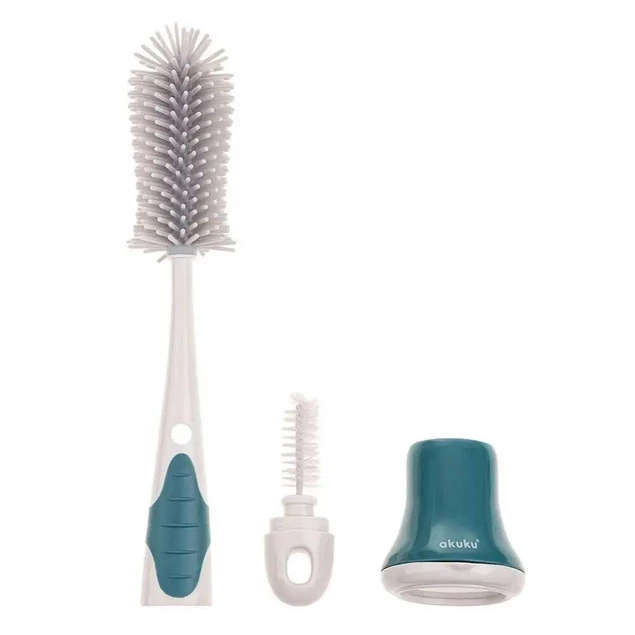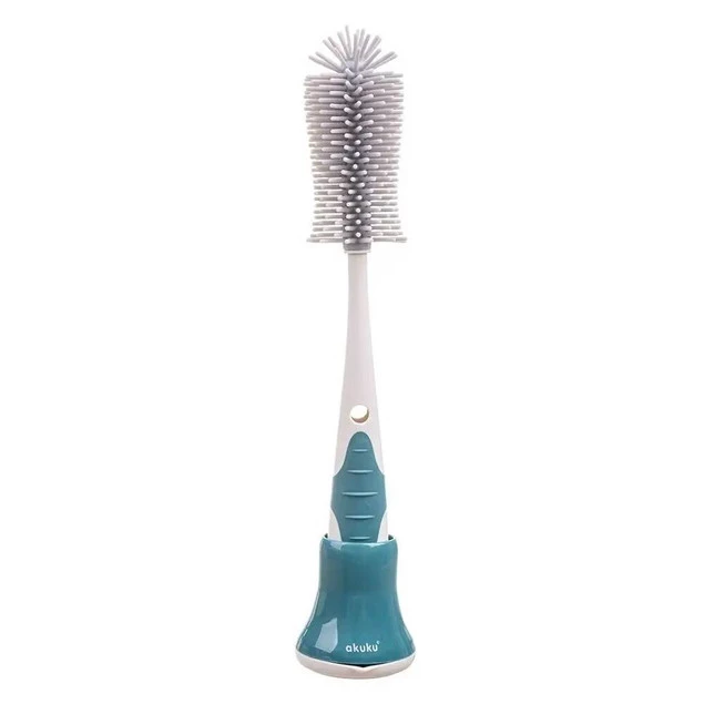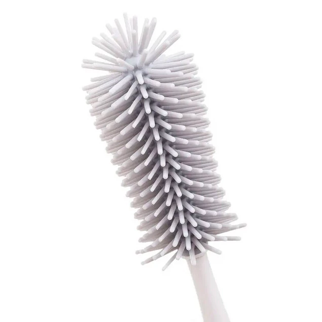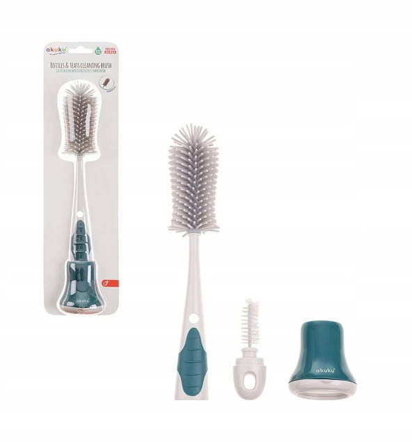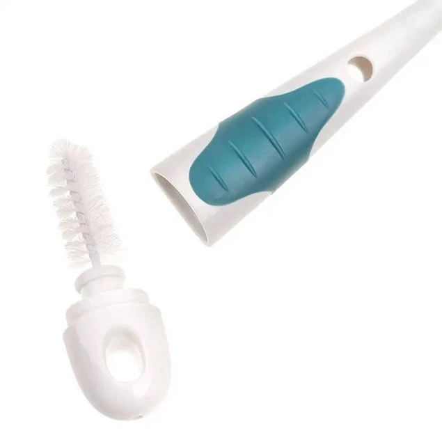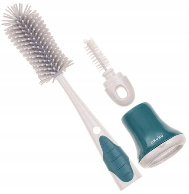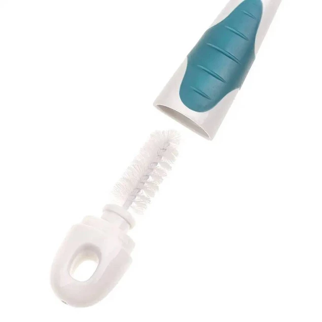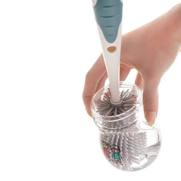 Szczotka do czyszczenia butelek z miękkim silikonowym włosiem zapewnia mycie butelek i pojemników bez zarysowań oraz zadrapań. Odpowiednio wyprofilowana końcówka dociera do trudno dostępnych miejsc, a wygodna antypoślizgowa rączka zapewnia stabilny uchwyt. Posiada spiralną końcówkę do czyszczenia smoczków. Do szczotki dołączona jest podstawka, aby wygodnie przechowywać ją w pozycji pionowej. Wykonana z trwałych i bezpiecznych materiałów, nie zawierających Bisfenolu A (0% BPA).