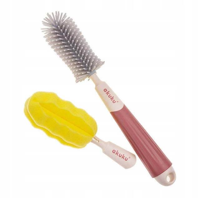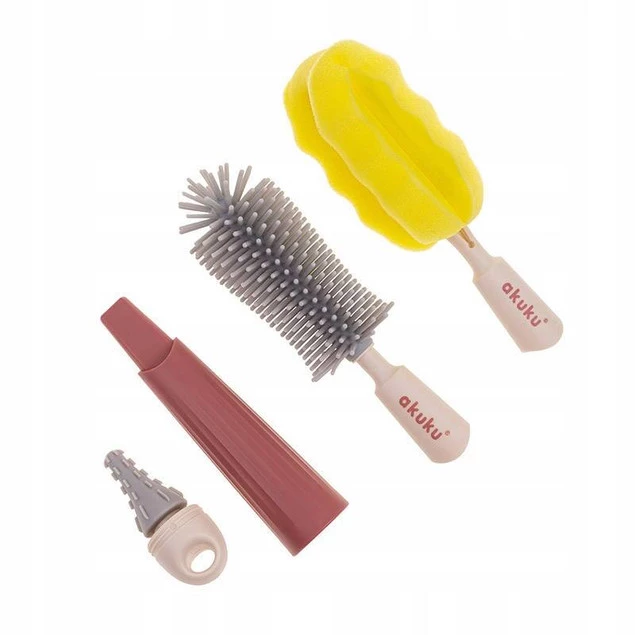Zestaw jest wyposażony w dwie wymienne końcówki do mycia butelek, składa się ze szczotki z miękkim silikonowym włosiem, która zapewnia mycie butelek i bidonów bez zarysowań oraz zadrapań oraz wymiennej końcówki z gąbką, która jest tak wyprofilowana aby jeszcze dokładniej wyczyścić butelkę. Odpowiednio wyprofilowana końcówka dociera do trudno dostępnych miejsc, a wygodna antypoślizgowa rączka zapewnia stabilny uchwyt. Zestaw zawiera dodatkowo silikonową końcówkę do czyszczenia smoczków. Szczotka posiada otwór do zawieszenia w celu osuszenia przed kolejnym użyciem. Wykonana z trwałych i bezpiecznych materiałów, nie zawierających Bisfenolu A (% BPA).