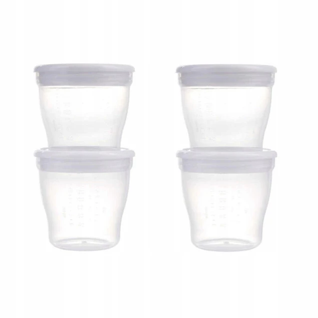 Praktyczne pojemniki umożliwiają długotrwałe przechowywanie pokarmu utrzymując jego wysoką jakość. Posiadają szczelne pokrywki, dzięki czemu nic się z nich nie wylewa nawet gdy pojemnik jest przechylony. Można je ustawić jeden na drugim. Posiadają czytelną skalę. Pokrywka może także pełnić funkcję podstawki - dla lepszej stablizacji przy przelewaniu płynu. Wykonane zostały z materiału przeznaczonego do kontaktu z żywnością. W opakowaniu 4 pojemniki z pokrywkami o pojemności 180ml.