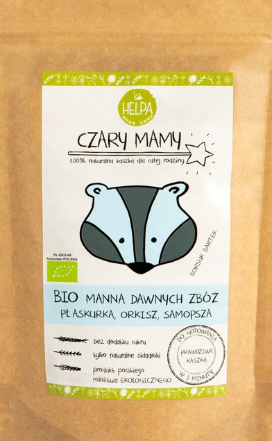 Bio Manna Dawnych Zbóż: ekologiczna pełnoziarnista kaszka manna orkiszowa (40%), z samopszy (30%), z płaskurki (30%).