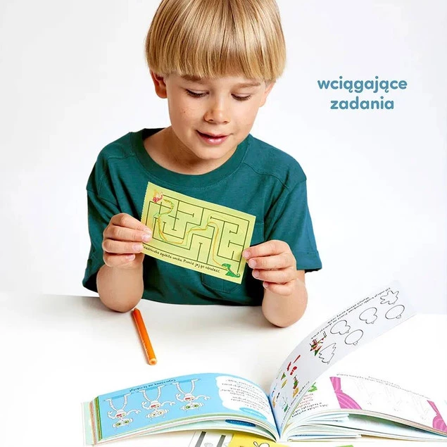 Edukacyjna książeczka dla starszych przedszkolaków zawiera 240 wciągających zabaw i jest pełna nowej wiedzy. Każda strona składa się z fragmentu z ciekawostką lub zadaniem i części do pisania, rysowania, zakreślania, którą można oderwać dzięki perforacji. Dzięki poręcznemu formatowi możecie ją zawsze mieć przy sobie!