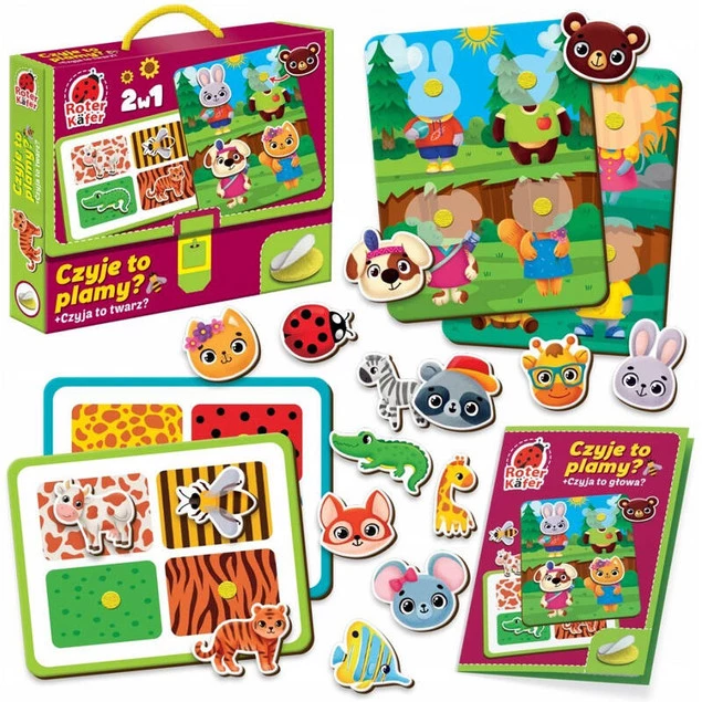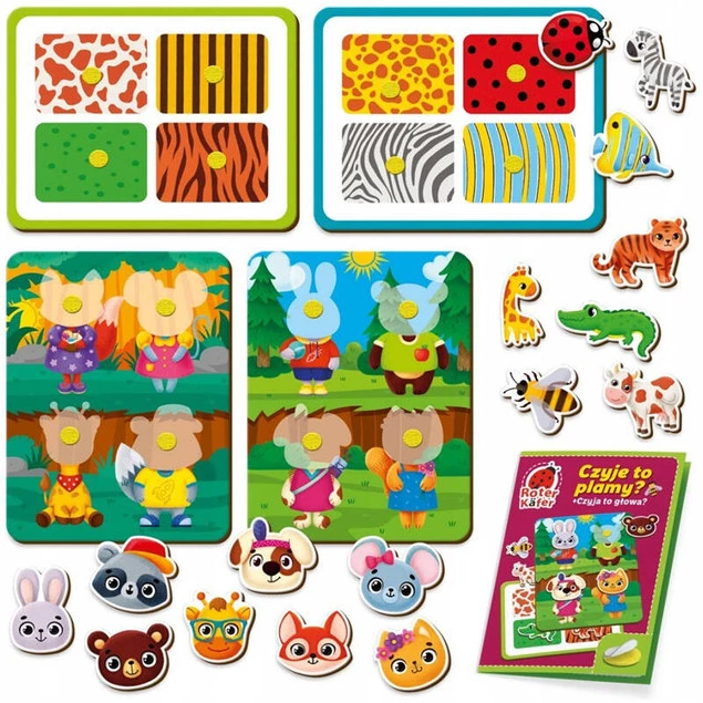 Uczymy się zwierząt i ich kolorów! Umocujcie figurki przy pomocy rzepek do plansz we wskazanych miejscach. Zebra w czarno-białe paski i zielony krokodyl z plamkami. Przymocuj zwierzęta do plansz do gry z ich kolorem. Gotowe! Gra rozwija wyobraźnię, logiczne myślenie, pamięć oraz umiejętności motoryczne. W zestawie: 4 plansze, 16 figurek, 32 rzepki.