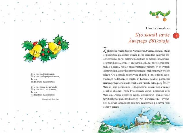 Święta Bożego Narodzenia to magiczne i niezwykłe chwile. Radość oczekiwania na pierwszą gwiazdkę wtapia się w bajeczny zimowy krajobraz. Rozświetlone choinki, kolorowe bombki, lampki w oknach... wywołują zachwyt i budzą wyobraźnię. Te święta kochają wszyscy, a najmocniej dzieci. I o tym opowiadają kolejne historie tej książki. Spotykamy Mikołaja, skrzaty, elfy; poznajemy zdarzenia z pogranicza prawdy i bajki, które z najpiękniejszymi życzeniami dedykujemy naszym Młodym Czytelnikom pod choinkę.