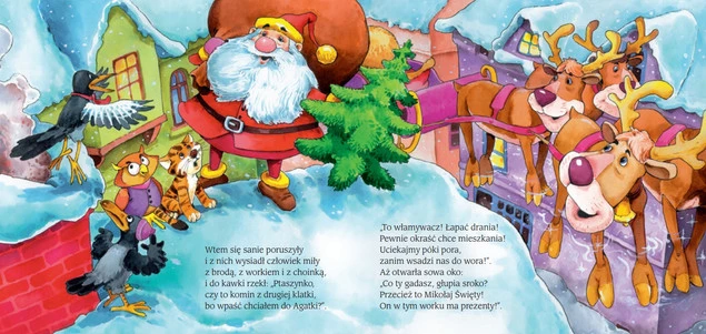 Zabawna i rymowana opowieść z morałem - o tym, że potrzebujemy siebie nawzajem! Gdy w ciepłym domku Agatka spogląda przez okno jak smutna bogatka, wtem z łoskotem wpadają do niej Mikołaj z bezdomnym kotem. Któż by pomyślał, że z tej zadymy wyłoni się dla niej pewien prezent miły!