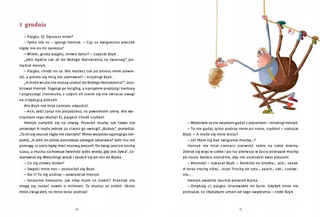 1 grudnia w pajęczą sieć zaplątuje się mucha. Pająk chce zjeść ją na święta i początkowo nawet nie zamierza się do niej odzywać, bo "z jedzeniem się przecież nie rozmawia!", ale każdego dnia mucha coraz skuteczniej przekonuje pająka, by ją uwolnił. I tak przez 24 rozdziały, aż do Wigilii, wspólnie przeżywają najróżniejsze zabawne przygody - na przykład pająk zamawia pizzę. Zamówienie dostarcza biedronka, którą pająk również chce pożreć, ale mucha grozi, że jeśli pająk to zrobi, ona przestanie jeść i do Wigilii będzie bardzo chuda, więc nie będzie z niej pysznej tłustej świątecznej pieczeni. W Wigilię pająk uwalnia również muchę, bo stwierdza, że spędził z nią najpiękniejszy adwent w życiu i że przyjaciół się nie zjada.