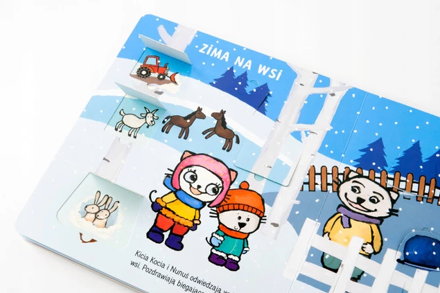 Książki z okienkami do odkrywania ukrytych niespodzianek to jedne z ulubionych książek maluchów! Okienka kryjące w sobie mnóstwo niespodzianek są wyjątkową atrakcją dla dzieci, które lubią poznawać świat. To właśnie do tej kategorii zalicza się książka Kicia Kocia i Nunuś. Jaka piękna zima! – jedna z najnowszych pozycji w serii. Odkrywanie tajemnic kryjących się w okienkach to wielka frajda dla każdego dziecka, dlatego książeczki z okienkami są tak lubiane! Dzięki książkom z okienkami dzieci mogą – poza odkrywaniem uroków zimy – wraz z ulubioną bohaterką bawić się książeczką. Mogą także pomóc Nunusiowi znaleźć ulubionego szczurka, zobaczyć też, kto mieszka w lesie, a także pomóc odnaleźć zaginioną walizkę!