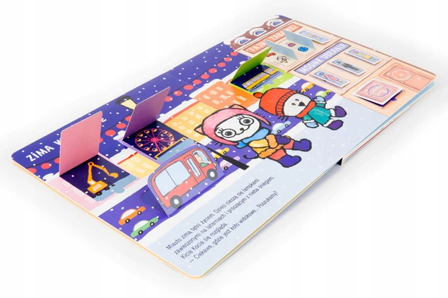 Kicia Kocia i Nunuś lubią zimę i zabawy na śniegu. Razem z nimi mali czytelnicy zobaczą, jak wygląda zima w mieście, w parku, a także na wsi i w lesie. Co robią zimą zwierzęta? Co jedzą? W co zimą bawią się dzieci? Tego czytelnicy dowiedzą się z tej książki – pełnej sekretów ukrytych pod okienkami!