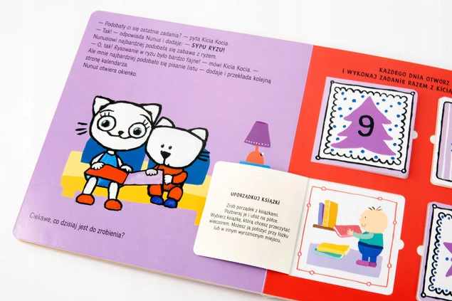 Kicia Kocia i Nunuś. Czekamy na święta! jest kolejną pozycją, dzięki której mali czytelnicy mogą odkrywać przygody Kici Koci oraz jej braciszka. Tajemnice ukryte w 24 otwieranych okienkach spowodują, że czas z książeczką będzie dla najmłodszych wspaniałą zabawą – umili im także oczekiwanie na święta Bożego Narodzenia!