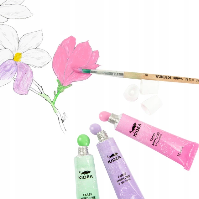Farby akrylowe w 12 pastelowych odcieniach od KIDEA przypadną do gustu każdemu małemu artyście. Dobrze kryjące i niezwykle wydajne farbki pozwolą Ci stworzyć wyjątkowe dzieła sztuki nasycone kolorami.