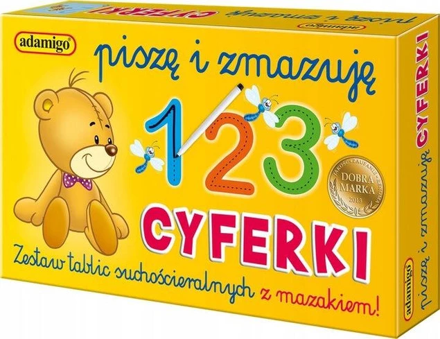 Z wyjątkowym zestawem od ADAMIGO Twój mały przedszkolak otworzy drzwi do fascynującego świata literek i opanuje sztukę pisania pierwszych wyrazów. Do wspólnej zabawy zaprosi dziecko przesympatyczny Miś, który nie może się już doczekać, by nauczyć Twój mały skarb nowych umiejętności. Z tak uroczym przyjacielem maluszek chętnie podejmie wyzwanie, a ćwiczenia sprawią mu radość. Zadania dla małego przedszkolaka umieszczone są na 16 dwustronnych tablicach, na których dziecko będzie pisało specjalnym, suchościeralnym markrem. Karty składają się z linijek, w których malec będzie mógł trenować nowe umiejętności. Każda z nich zawiera kilka wykropkowanych literek i wyraz, by dziecko mogło zapoznać się z ich pisownią. Pisanie mały przedszkolak może trenować do woli! W razie niepowodzenia wystarczy przetrzeć tablicę szmatką i można zacząć zadanie od nowa. Karty zadań zdobią wizerunki sympatycznego Misia i przedmiotu, nawiązującego do literki lub wyrazu które się na nich znajdują. Z zestawem PISZĘ I ZMAZUJĘ LITERKI ADAMIGO zdobywanie nowych umiejętności sprawi dziecku wiele radości.