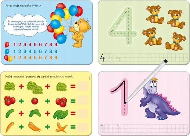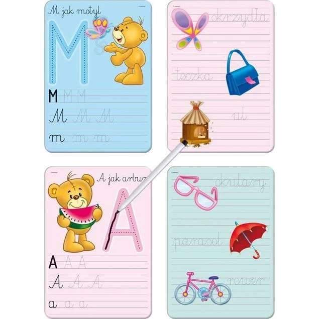 Pierwsze próby pisania to wyzwanie dla każdego przedszkolaka. Z zestawem od ADAMIGO dziecko może podejmować wielokrotne próby i ćwiczyć pisownie do uzyskania zadowalających efektów. Podczas wykonywania ćwiczeń malec trenuje motorykę małą i ogólną sprawność dłoni, wyrabia nawyk prawidłowego trzymania markera, który jest podstawą szybkiego i czytelnego pisania w przyszłości. Uczy się cierpliwości, dokładności i podążania za wskazówkami. Całość wykonana została z materiałów najwyższej jakości, by zapewnić długie i bezpieczne użytkowanie.