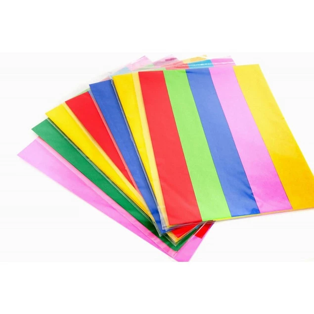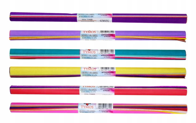 - Gładka bibuła TYMOS w dziesięciu intensywnych kolorach, tj. żółtym, białym, zielonym - jasnym i ciemnym, błękitnym, niebieskim, pomarańczowym, fioletowym, czerwonym oraz różowym.