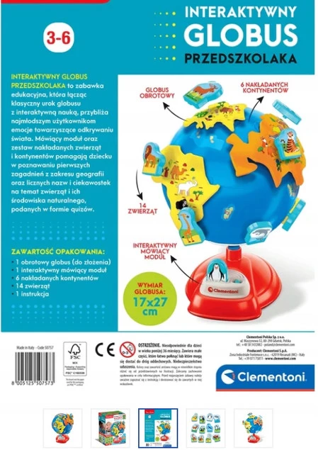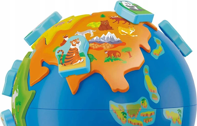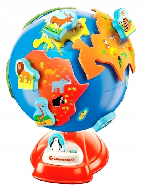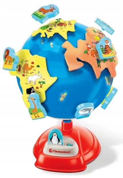 Wielki elektroniczny globus z recykingowanego plastiku, z kontynentami i zwierzętami do wpinania, aby w ten sposób poznawać liczne ciekawostki o faunie i jej habitacie. Po włożeniu wyprofilowanych zwierząt do elektronicznego modułu w podstawie globusu dziecko może usłyszeć wiele informacji i ciekawostek o każdym ze zwierząt. Globus proponuje również wesołe quizy, które dziecko rozwiązuje poprzez umieszczenie prawidłowego zwierzęcia na globusie. Zabawa trwa w najlepsze dzięki grze planszowej, polegającej na odpowiadaniu na pytania i umieszczaniu zwierząt na ich kontynentach, zanim nadejdzie zanieczyszczenie. Eko-przyjazny produkt Made in Italy, wyprodukowany z materiałów z recyklingu.