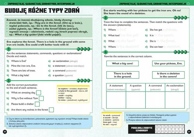 "Minecraft. Język angielski. Megazadania. 8+" to niezwykły zeszyt zadań do nauki języka angielskiego oraz zaproszenie do emocjonującej przygody w świecie Minecrafta. Książka przeznaczona jest dla dzieci w wieku powyżej 8 lat, ale z pewnością sprawi frajdę fanom gry w każdym wieku. Eksplorowanie kolejnych biomów, podejmowanie wyzwań i rozwiązywanie zagadek osadzonych w minecraftowym uniwersum to doskonała zabawa na 64 stronach i najlepsza forma nauki języka angielskiego, jaką można sobie wyobrazić! Wypełniając kolejne misje, dziecko ćwiczy umiejętności językowe. Książka ta jest doskonałym uzupełnieniem i rozszerzeniem materiału szkolnego, dzięki czemu rozbudza ciekawość językową dzieci i wzmacnia ich kompetencje oraz pewność siebie na gruncie języka angielskiego. W książce znajdują się zadania z zakresu różnych działów lingwistyki, takich jak: pisownia i wymowa, słownictwo, gramatyka, interpunkcja, a także komponowanie wypowiedzi. Wszystkie zagadnienia mają teoretyczne wprowadzenie w języku polskim oraz atrakcyjne zadania opracowane w języku angielskim, oparte na aktywnościach takich jak: rozwiązywanie krzyżówek, uzupełnianie luk w zdaniach, ćwiczenie pisania po śladzie, szukanie ukrytych słów w wykreślankach i wężach wyrazowych, tworzenie własnych wypowiedzi, opisywanie ilustracji. Słowniczki z listą wprowadzonych w danym rozdziale trudniejszych słów oraz polskie tłumaczenia poleceń zamieszczone u dołu strony sprawiają, że całość jest przystępna i niezwykle skuteczna. Za każde rozwiązane zadanie dziecko zdobywa szmaragdy, które na końcu książki może "wymienić" na nagrody. O odpowiedni poziom zaangażowania dba też wciągająca opowieść o przygodach Evy i Toma, towarzyszących czytelnikowi przez całą książkę. "Minecraft. Język angielski. Megazadania. 8+" to oficjalne wydanie na licencji Mojanga, a edycja polska powstała we współpracy z doświadczonym nauczycielem języka angielskiego i metodykiem nauczania wczesnoszkolnego. W serii ukazały się również "Megazadania" dla młodszych i starszych fanów Minecrafta: siedmiolatków i dziewięciolatków, a w przygotowaniu są także tomy dla dziesięcio-, jedenasto- i dwunastolatków. Polecamy także przeznaczoną dla tych samych grup wiekowych serię książek do nauki matematyki z Minecraftem: Minecraft. Matematyka. Megazania. 7+ Minecraft. Matematyka. Megazania. 8+ Minecraft. Matematyka. Megazania. 9+ Minecraft. Matematyka. Megazania. 10+ Minecraft. Matematyka. Megazania. 11+ Minecraft. Matematyka. Megazania. 12+ Zarówno seria matematyczna, jak i językowa to idealne połączenie ulubionej gry Minecraft i przyjaznej edukacji. Książki sprawdzą się jako mądry prezent na urodziny, imieniny, święta czy zakończenie roku szkolnego.