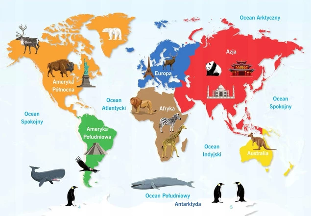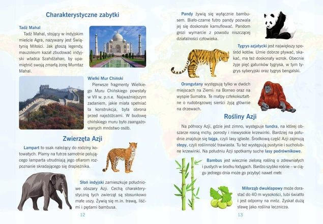 Atlas świata dla dzieci to książka, w której znajdziesz mnóstwo informacji o kontynentach. Poznasz państwa, niezwykłe miejsca, zabytki, a także rośliny i zwierzęta Europy, Azji, Afryki, Ameryki Północnej, Ameryki Południowej, Australii i Oceanii oraz Antarktydy. Przejrzyste mapy, ilustracje i zdjęcia pomogą ci w zdobywaniu wiedzy o wszystkich kontynentach.