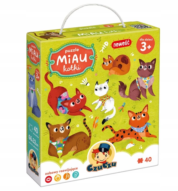 Puzzle Miau Kotki składają się z 40 elementów i świetnie sprawdzą się jako kolejne puzzlowe wyzwanie dla trzylatków i starszaków. Zabawa dla przedszkolaków jest naturalnym polem do eksperymentowania i odkrywania świata, a urocze koty i kociaki inspirują do wielu rozwijających aktywności. Możecie na przykład: